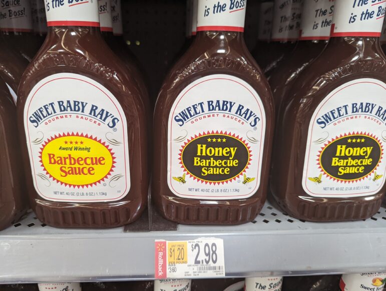 Sweet Baby Ray’s BBQ Sauce (cost per lb., difference from July 20, 2022 in parentheses)