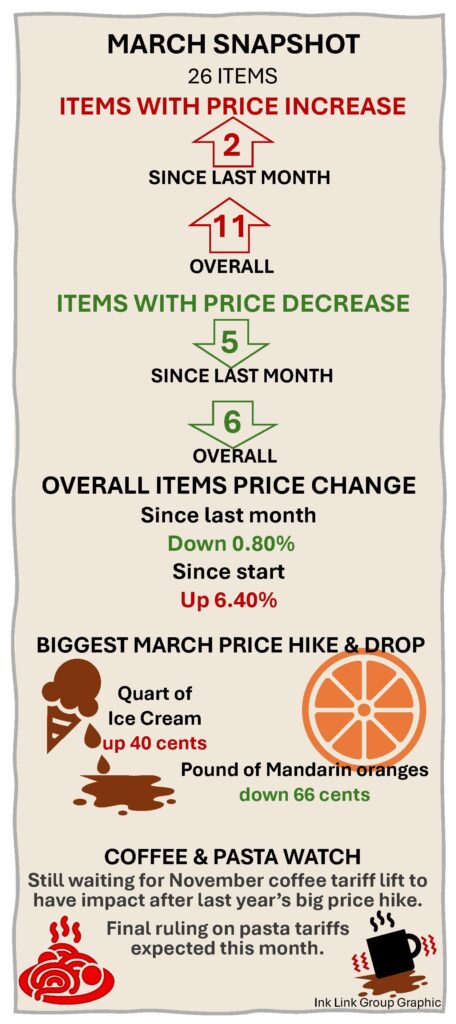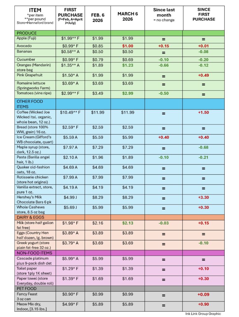Aside from tariffs, a lot goes into price fluctuations, including seasons, weather, store preference and store decisions. I’ve included items likely to be affected by tariffs as well as some that may not be. There are likely different prices and fluctuations for similar items at other stores, but this is a reflection of my shopping list, not a comparison-shopping exercise or a definitive picture of what certain items cost everywhere.
