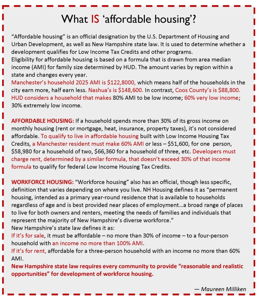 Affordable housing is defined by HUD as being for tenants earning 60% of less of the area median income, with rents set at 30% of that. The 2025 AMI for Manchester is $58,980 for an individual, which means a one-person household must earn $51,600 or less to qualify for affordable housing. AMI increases with household size. Workforce housing is a state designation and has a more flexible definition, but also must have rents affordable to people who make 100% of AMI or less. [See box below]
