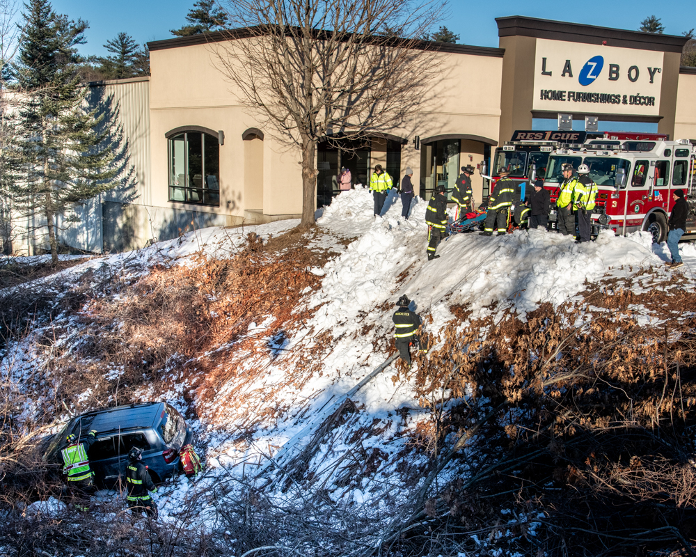 Description of Incident: ย On February 4, 2024, at 7:40 a.m., Engine 3 was dispatched to 1949 South Willow St. for a car down an embankment. Engine 3 arrived and determined a vehicle had driven off the side of the parking lot and went down a steep embankment and was hung up on brush a few feet away from Cohas Brook that abuts the parking lot.