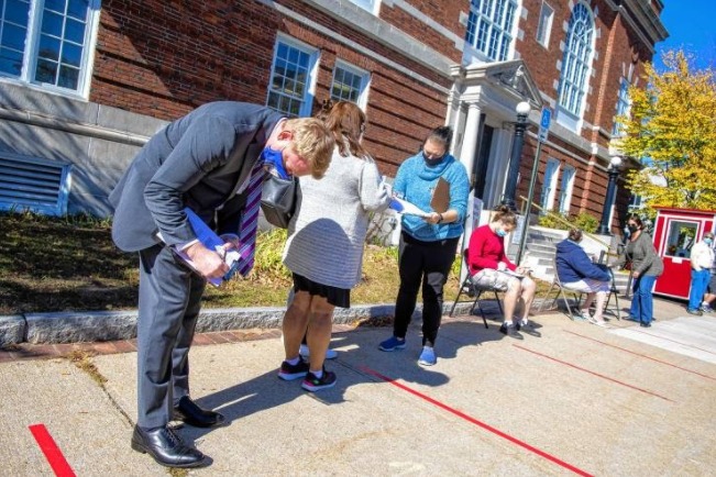Gubernatorial candidate Dan Feltes fills out paperwork to vote on Friday morning, October 9, 2020, in front of Concord City Hall. Feltes got a ballot and voted on the spot. Photo/Geoff Forester Concord Monitor Staff