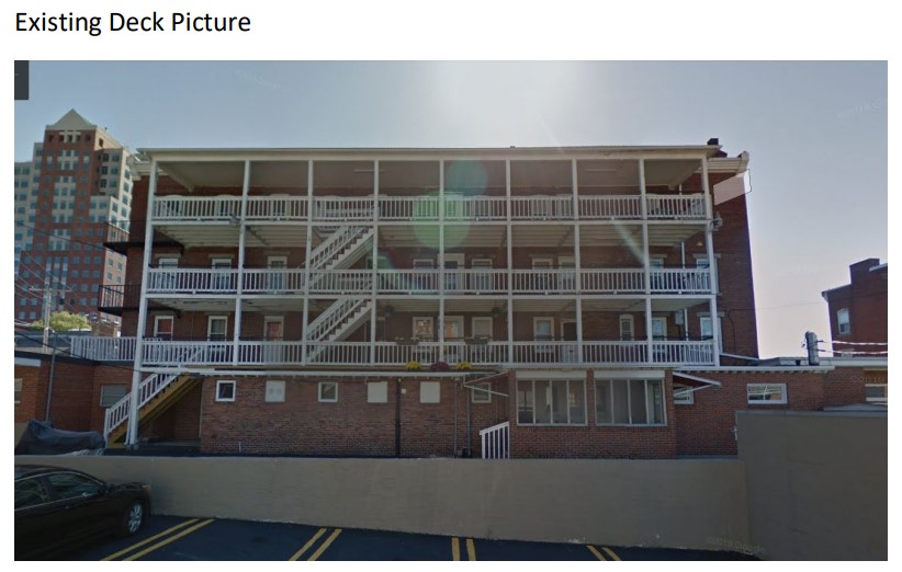 The owner of 63-67 Stark Street seeks approval for an in-kind replacement of the 3-story egress deck using pressure-treated lumber.