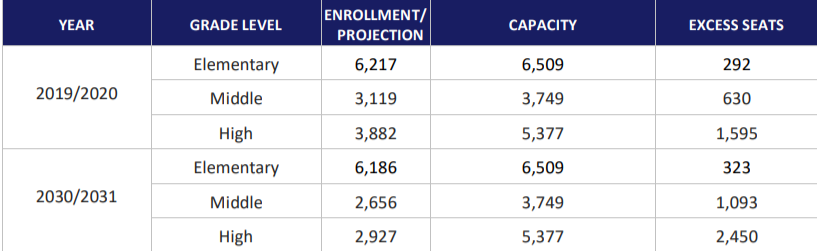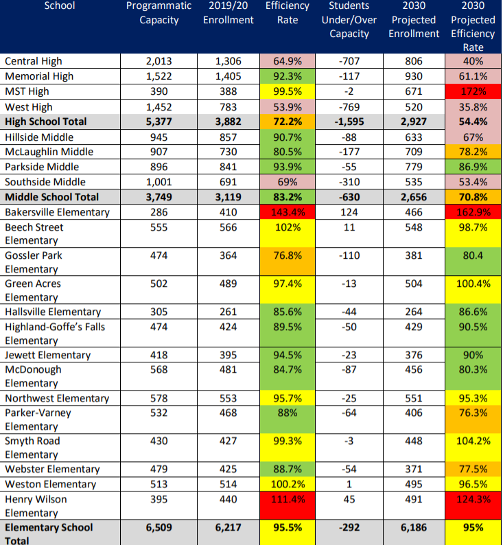 have expanded people/programs into every possible location in the building. The buildings with overcapacity likely lack core space โ restrooms, media center, cafeteria, hall spaces – to accommodate the enrollment. They may have to operate with multiple lunch periods and may be moving students at
