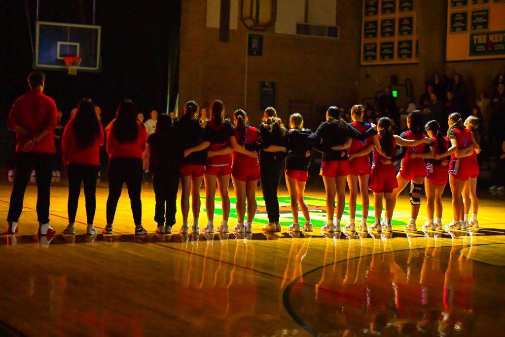 Trinity High School girls stand unified, arm-in-arm, during the National Anthem prior to their first-round game at Bishop Guertin. Stacy Harrison photo/Stacy Harrison Photography