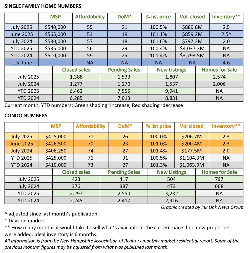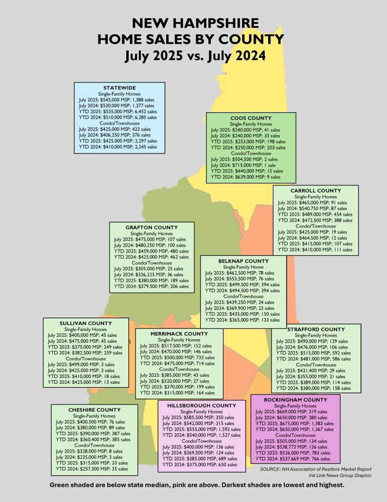 In Hillsborough County, which includes Manchester and Nashua, the $585,500 median sales price for a home in July was up from $542,000 in July 2024. It was the second-most expensive county to buy a single-family home in July, after Rockingham. The county year-to-date MSP is $555,000.