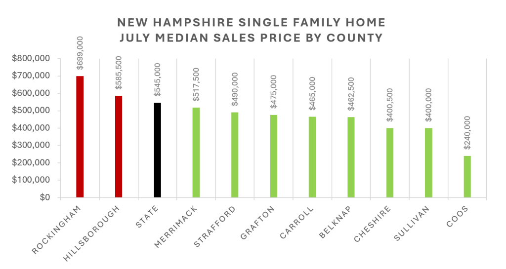 CONCORD, NH – Single-family home prices in Hillsborough and Rockingham counties are tens of thousands above those in the state’s other eight counties, continuing to push the state’s median sales price to a place out of reach for many.