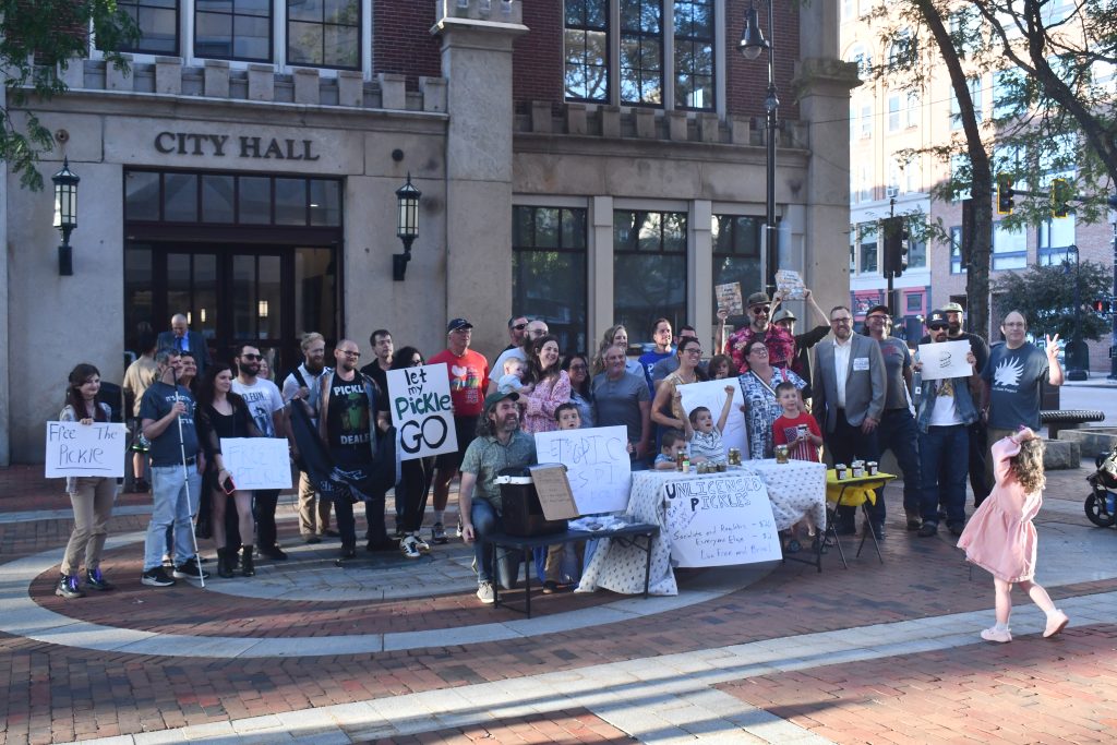 Prior to the meeting, a group of protesters advocating for the city to align with the state’s homestead food law held an event outside of City Hall where they sold homemade pickles and other items.