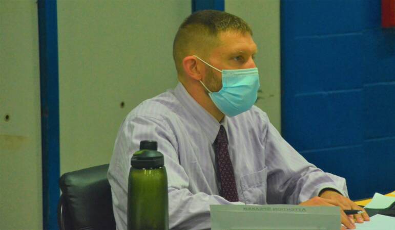 Clark Karolian (right) looks on incredulously at comments being made by David Boutin on May 26, 2021. Photo/Andrew Sylvia