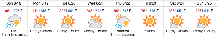 MANCHESTER, NH โ€“ Just when you start to daydream about sending the kiddos back to school and pumpkin spice everything, summer comes back with a vengeance. Expect at least three more days of hot โ€“ with a high of 91 degrees expected Monday, 89 on Tuesday and 86 on Wednesday. After that, some thunderboomers followed by decidedly milder days.