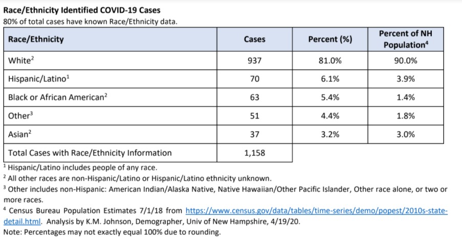 MANCHESTER, NH — For the first time, state officials released data showing the ethnic breakdown of confirmed COVID-19 patients, confirming what many feared — that minorities make up an outsized portion of the cases.