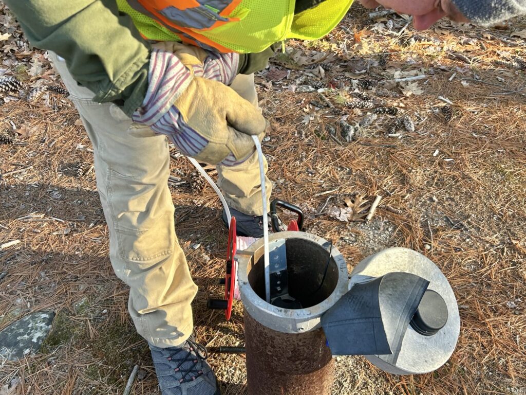 On the chilly morning of Monday, Dec. 22, Howley was in the field, conducting a quarterly checkup on two of those monitoring wells at a state forest trailhead in Concord. This is a regular appointment for Howley: While automated stations can be checked once a quarter, the state also maintains multiple wells that can’t fit automatic instruments and must be checked manually once per month.