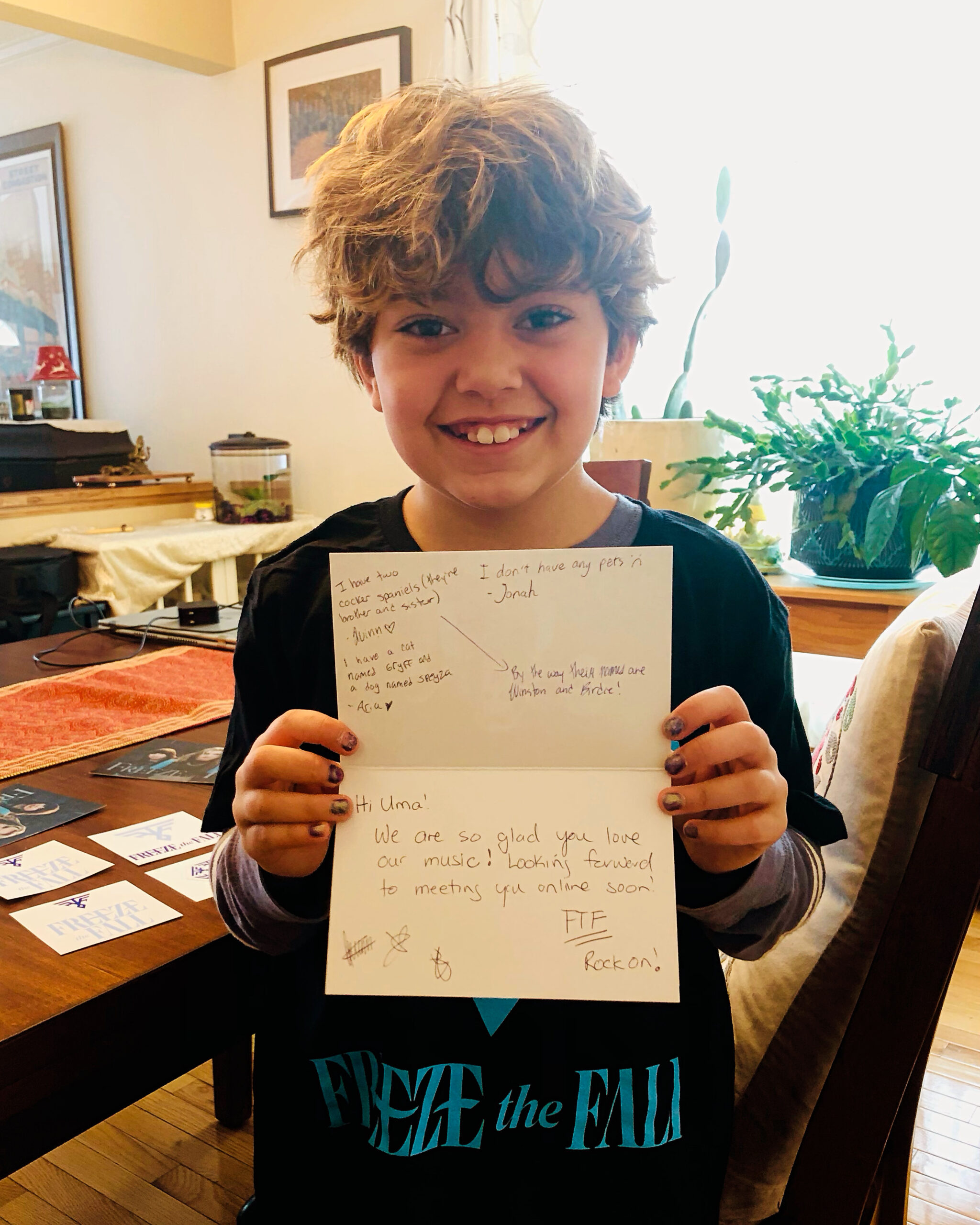 She wanted to be engaged. So, I did my best to facilitate, not really knowing what to expect. But much to our delight, the band members’ parents (who serve as their managers) got back to us, and my daughter and the band became pen pals.