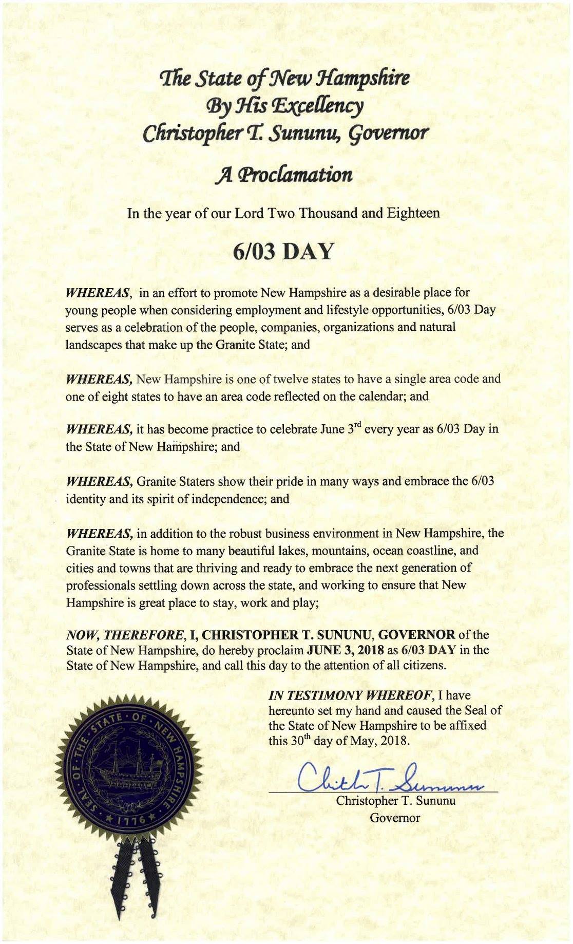 CONCORD, NH – It’s a happy day, New Hampshire … June 3, 2018 has been officially been declared as #603Day by Governor Chris Sununu.