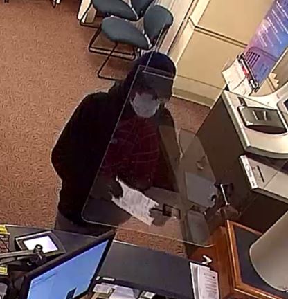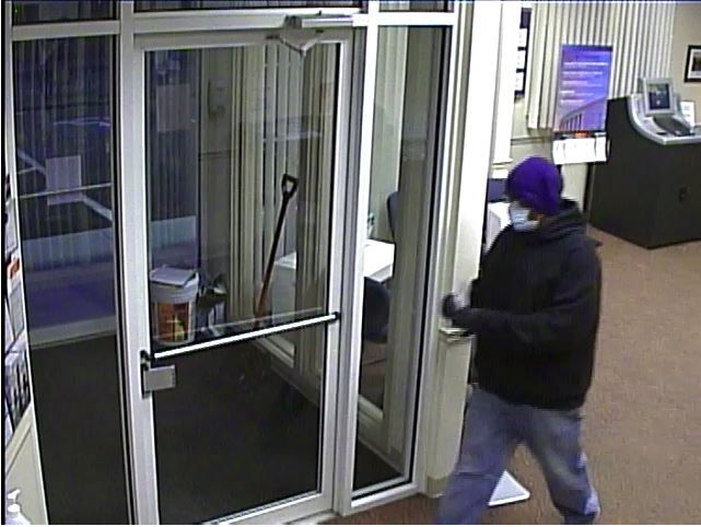 The robber is described as a husky male, approximately 5-foot-10, 210 pounds, last seen wearing a dark-colored hooded pullover sweatshirt, jeans with a tear in the right knee, black gloves, a royal blue winter hat and dark-framed glasses.