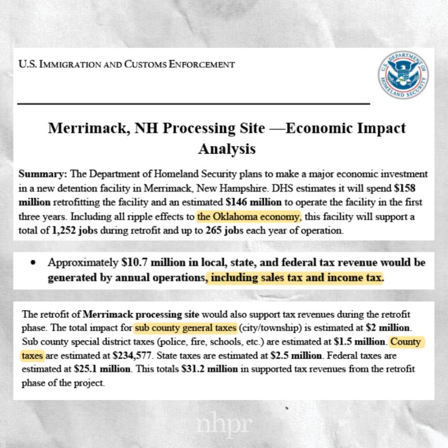 The documents include an economic impact analysis and a memo detailing the “ICE Detention Reengineering Initiative” and frame the planned ICE detention processing center in Merrimack as a boon for the local economy.