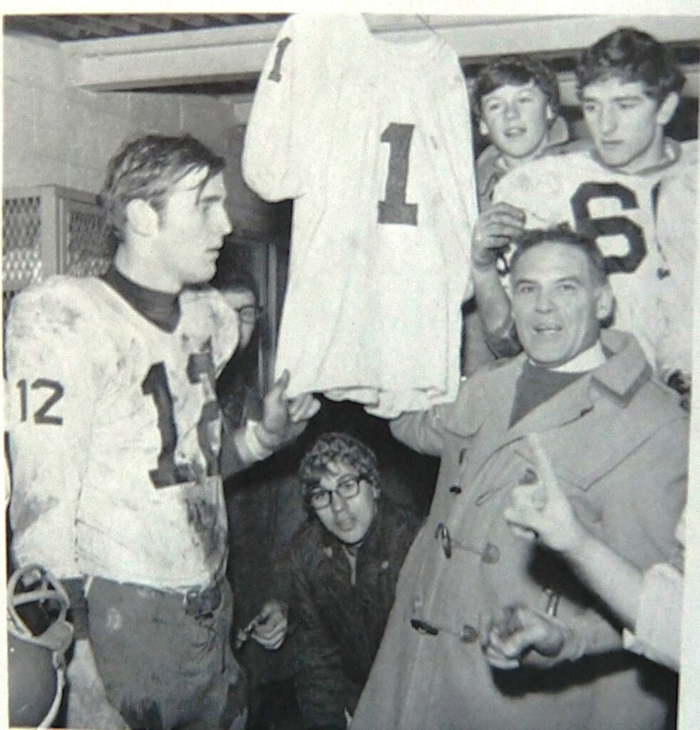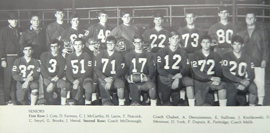 Though Haverhill and Nashua were formidable opponents, he most enjoyed the rivalry with Manchester Central, particularly Steve Schubert. He also looked forward to “knocking heads” with quarterback Steve Stetson of Laconia High.