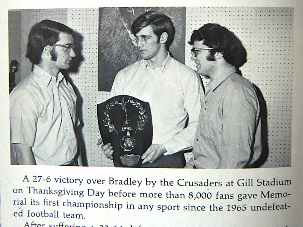 As for his most impacting coach, he had two…Bob Chabot and Hubie McDonough Jr. (both legends themselves). “Bob would always come up with a great game plan and Hubie would give the pre-game/halftime speeches. He used to get 110% out of us. He wouldn’t scream or yell. He’d just single guys out and talk to us in that voice of his. Together they’d bring you up to the level they wanted you to play at by the time you hit the field. They were really good together, really complimented each other.” The name of Memorial’s football field is a testament to that.