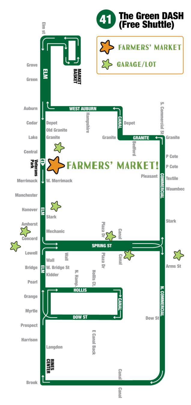 There are also several parking lots along theย Green Dashโ€™s Route, a FREE shuttle that runs every 30 minutes, and stops directly in front of Veterans Park! From anywhere on the loop, you can flag down the Green Dash bus that will bring you right to the market! You can park in one of the following locations and take the Green Dash to the Market: