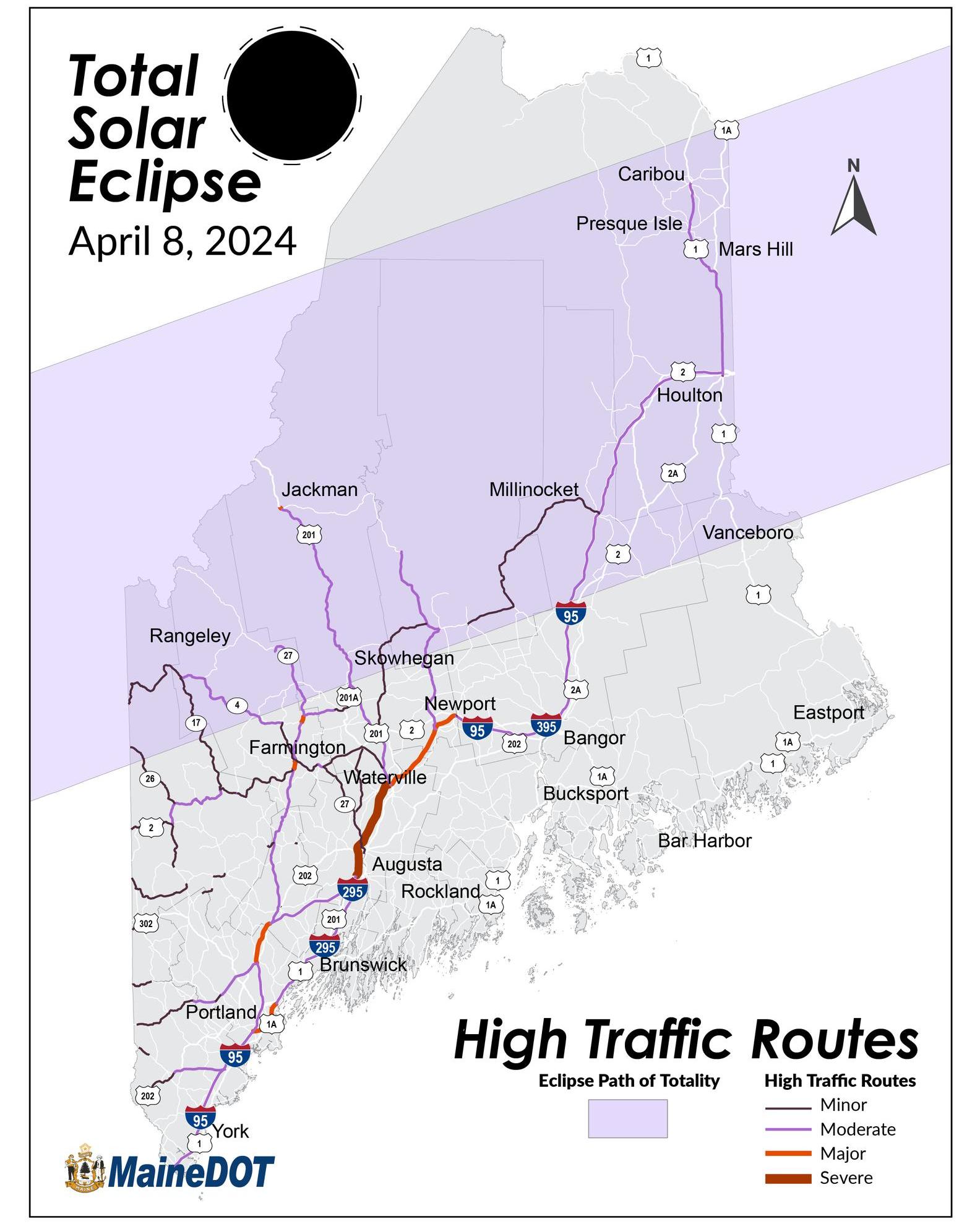 The Maine Department of Transportation is expecting severe traffic on Interstate 95. It’s in the path of totality, but it’s the only four-lane highway. If you are taking other routes, you’ll be on two-lane roads that also may have heavy traffic.