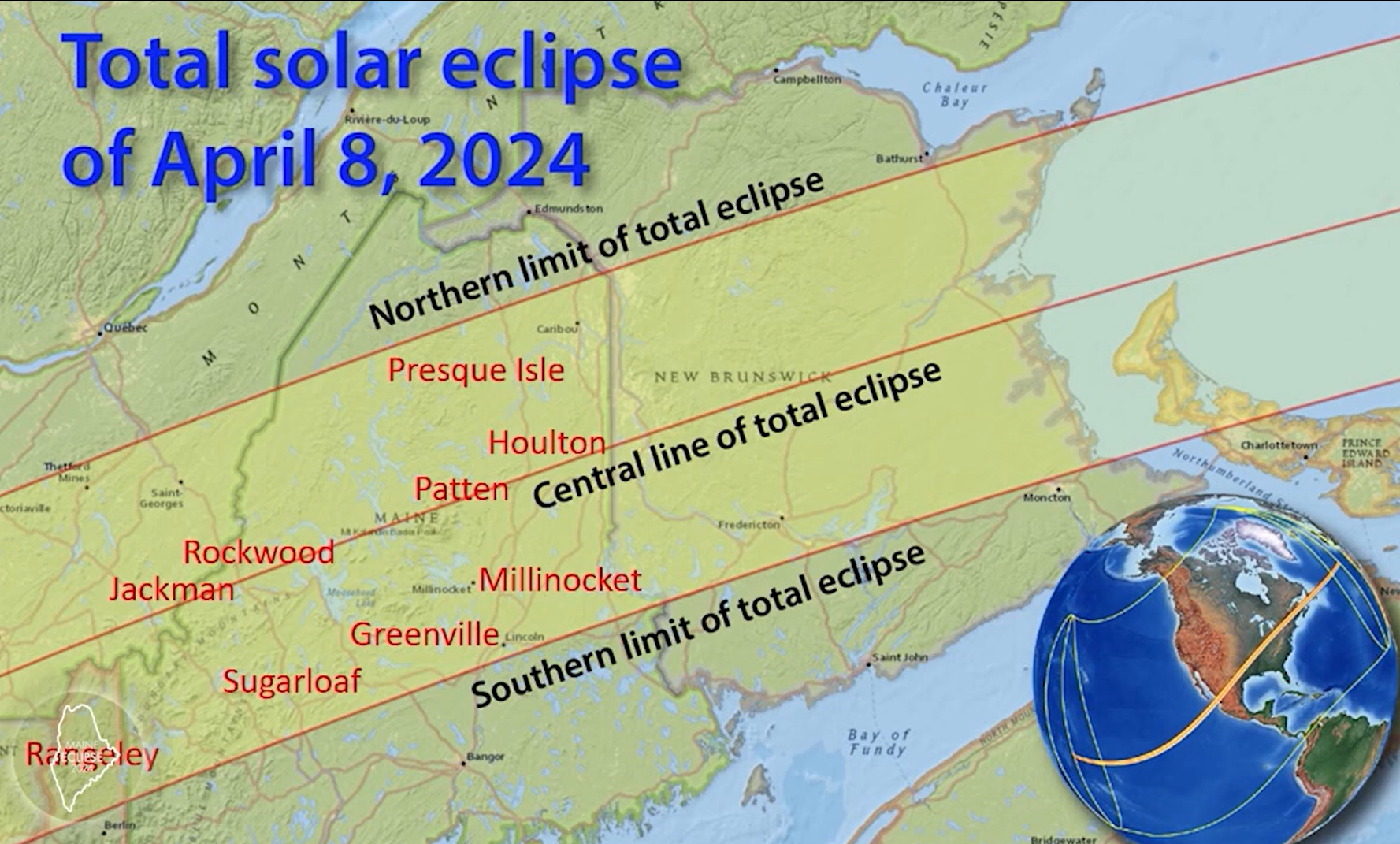 First the good news: Maine is one of the few of the 13 states in the path of totality that is forecast to be clear of clouds Monday, an Eclipse Day miracle for a state that’s notoriously overcast and wet in April. The 115-mile wide path of totality stretches some 250 miles, from Maine’s western border with New Hampshire to its eastern border with New Brunswick, and there’s plenty of room to spread out.