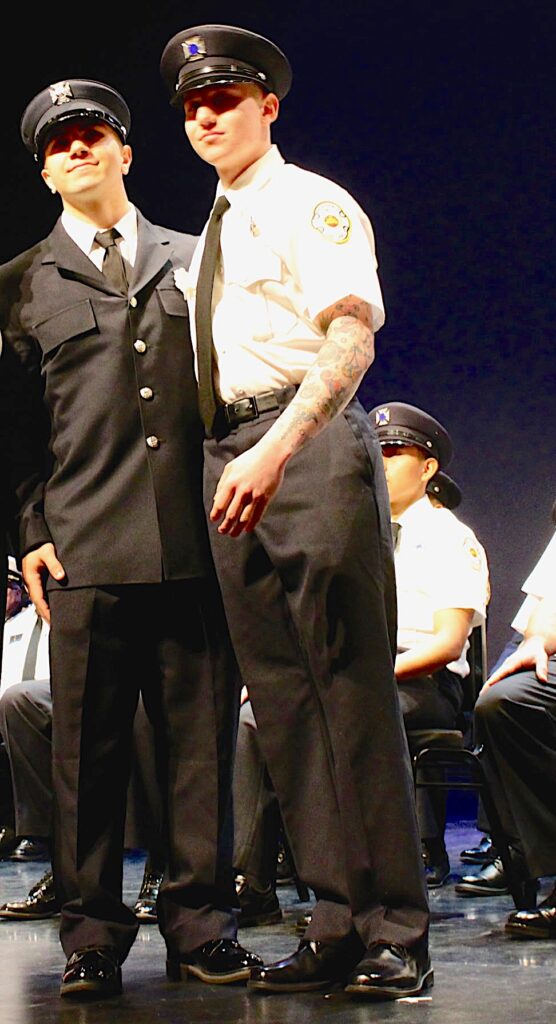 Manchester firefighter Jett Franggos, son retired Manchester fire captain Pete Franggos, pinned the badge on his friend and new Providence firefighter, Owen Graziano. Photo by Olivia Wozny.
