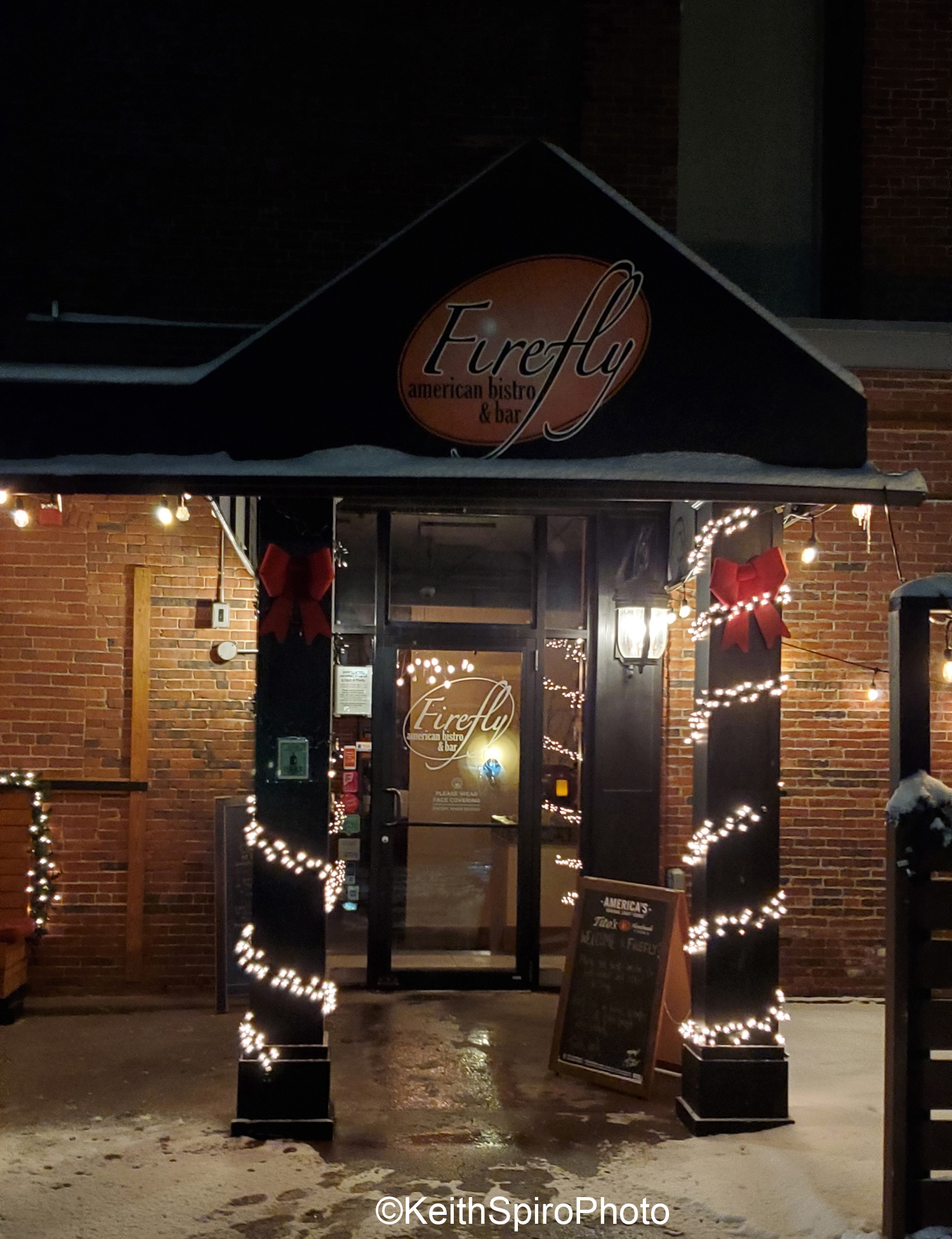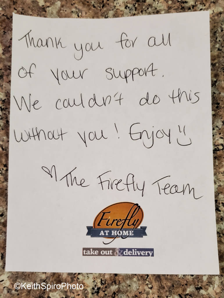 We chose Firefly American Bistro at 22 Concord St. We’ve eaten there before and have always enjoyed the ambiance as well as the food. We wondered how a winter drive-thru experience would compare. The menu appealed to us as did the promise of curbside pickup. Of note, they offer free delivery within 8 miles of the restaurant with a $50+ purchase but we wanted an excuse to get out even if it were just for cruising a short stint down Elm Street.