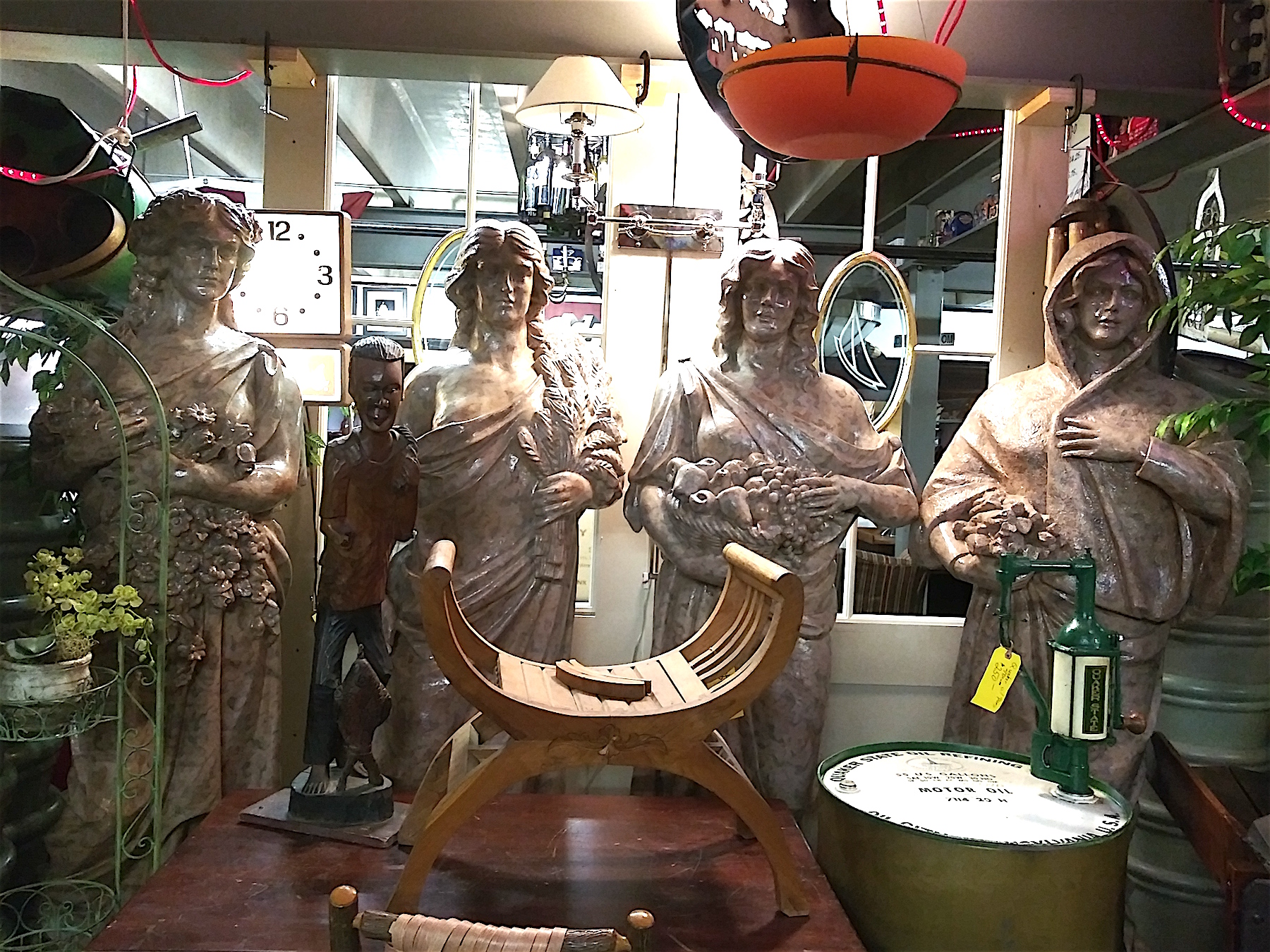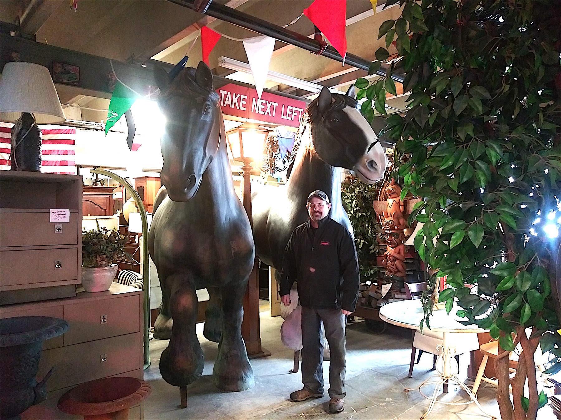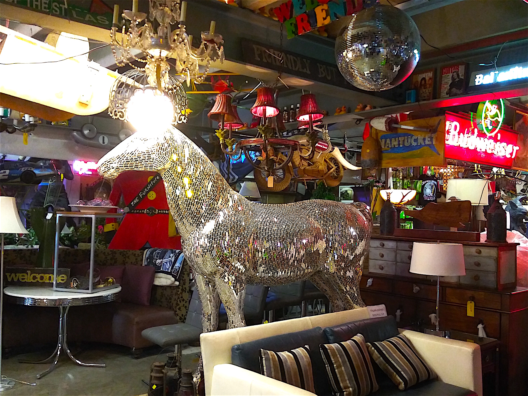 Six-foot-tall Grecian statues, a life-sized version of KISS, a gargantuan antique bar, storefront signs, two 9-foot-tall Clydesdale horses, flat screen TVs, mini refrigerators, barstools, lamps of every variety, and furniture from Art Deco to Louis to modern. Knick-knacks, paintings, chandeliers, movie props, memorabilia, antiques, fixtures, amusement park fare, and neon signs, along with countless additional items inhabit the offbeat emporium.