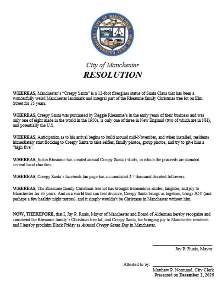 On Wednesday night, Creepy Santa got his own day on the city calendar when Mayor Jay Ruais read an official Resolution declaring Black Friday (the day after Thanksgiving) forever more to be known as Creepy Santa Day in the city of Manchester.