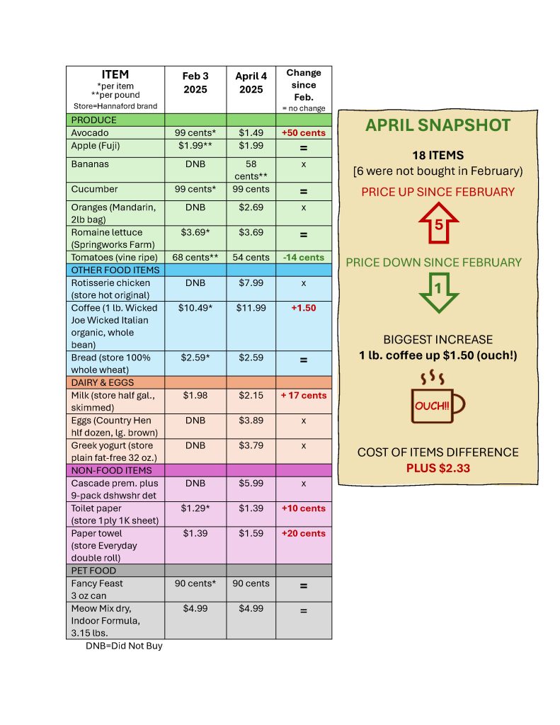 I first saved a receipt Feb. 3, when Trump announced he’d levy tariffs against Canada and Mexico. He postponed them shortly after, but I saved the receipt. This month’s snapshot is a baseline, a look at February to April (though I’ve added some items this month). I won’t add any more items, but though I tried to only put things on the list I buy regularly, there may be some months I won’t buy one of the items. I won’t skip a month on any item, unless it’s not available, which I’ll also note.