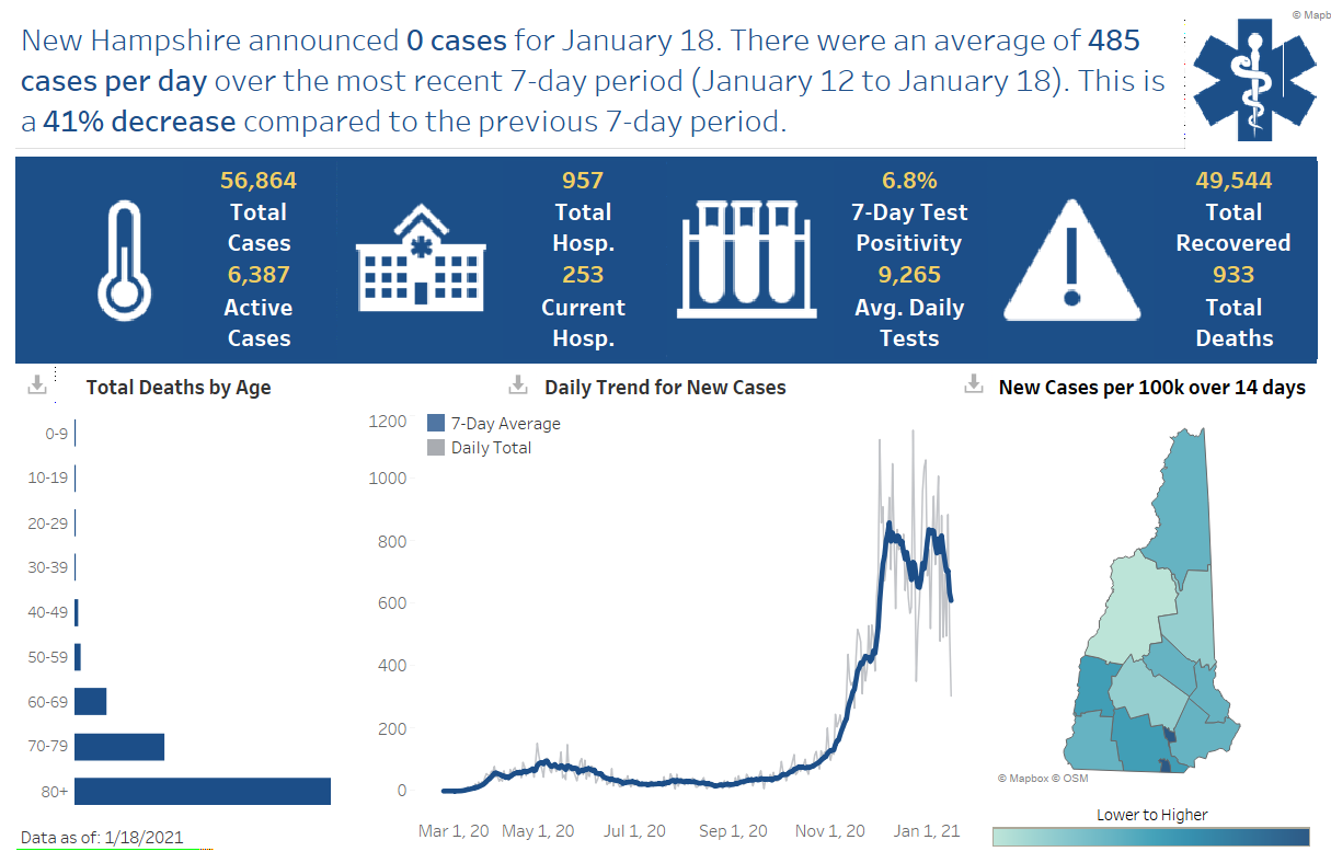 New Hampshire 2019 Novel Coronavirus (COVID-19) Summary Report (updated January 18, 2021, 9 a.m.)