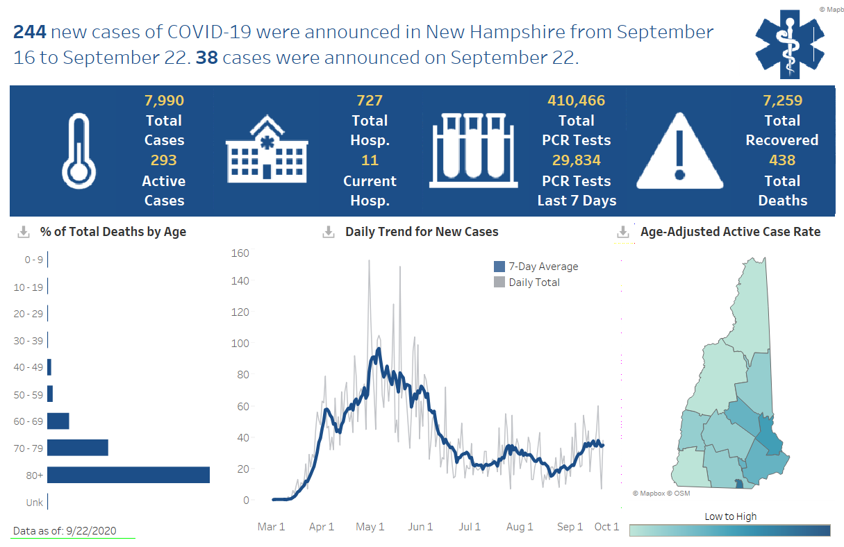 There are currently 335 individuals hospitalized with COVID-19. In New Hampshire since the start of the pandemic, there have been a total of 45,184 cases of COVID-19 diagnosed with 910 (2%) of those having been hospitalized.
