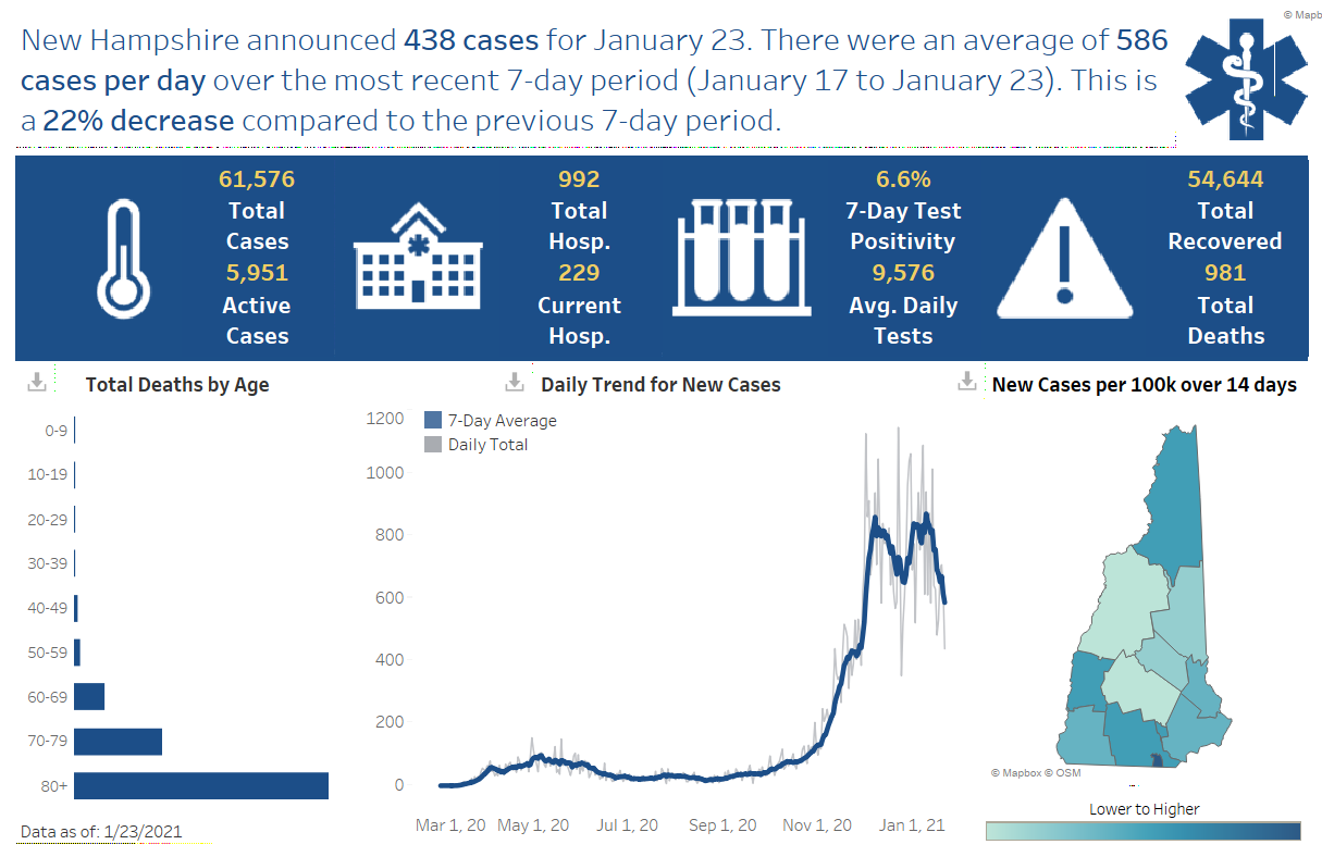 New Hampshire 2019 Novel Coronavirus (COVID-19) Summary Report (updated January 23, 2021, 9 a.m.)