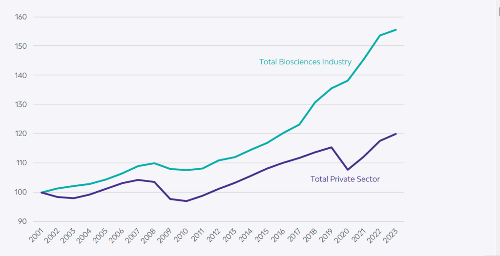 The average New Hampshire bioscience industry wage in 2023 was $136,164, which is 79% higher than the state’s private sector average and a little higher than the national average of $132,000 a year.