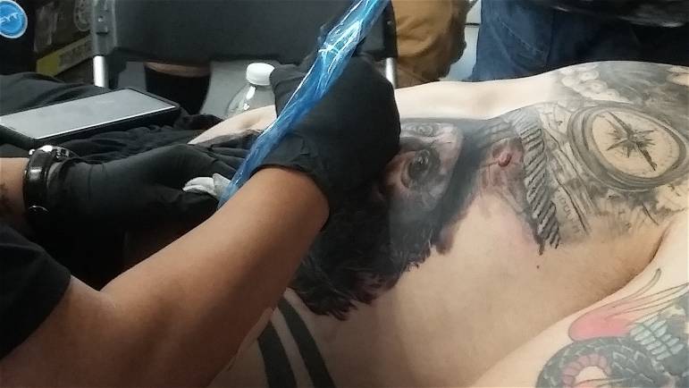 While making my way through the expo, I round a corner and am literally stopped in my tracks by the perfect example of the art of realism. An artist is meticulously tattooing Davey Jones on the side of his models stomach and the animated eyes have literally caught my eye. I stop and watch in silence. Sophath Phing of Ambition Tattoo Ink and Gallery in Danvers, MA, a Cambodian native with no formal art experience, is a humble natural. He has previously covered his model’s back and half of his chest.