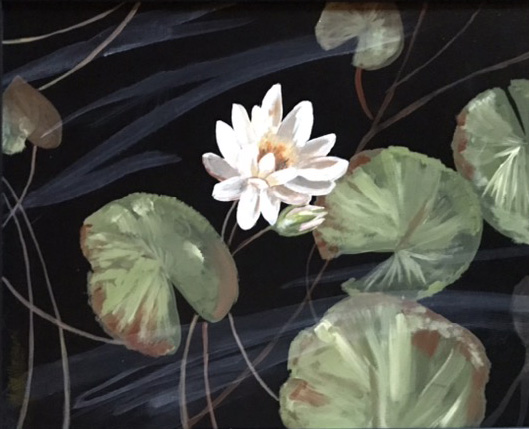 Each of these works has a combination of abstract and realistic elements incorporating birds, insects or flowers that symbolize hope and resilience. The intent of this work is to take a few moments to focus on the small details in nature that offer a respite from our busy lives.