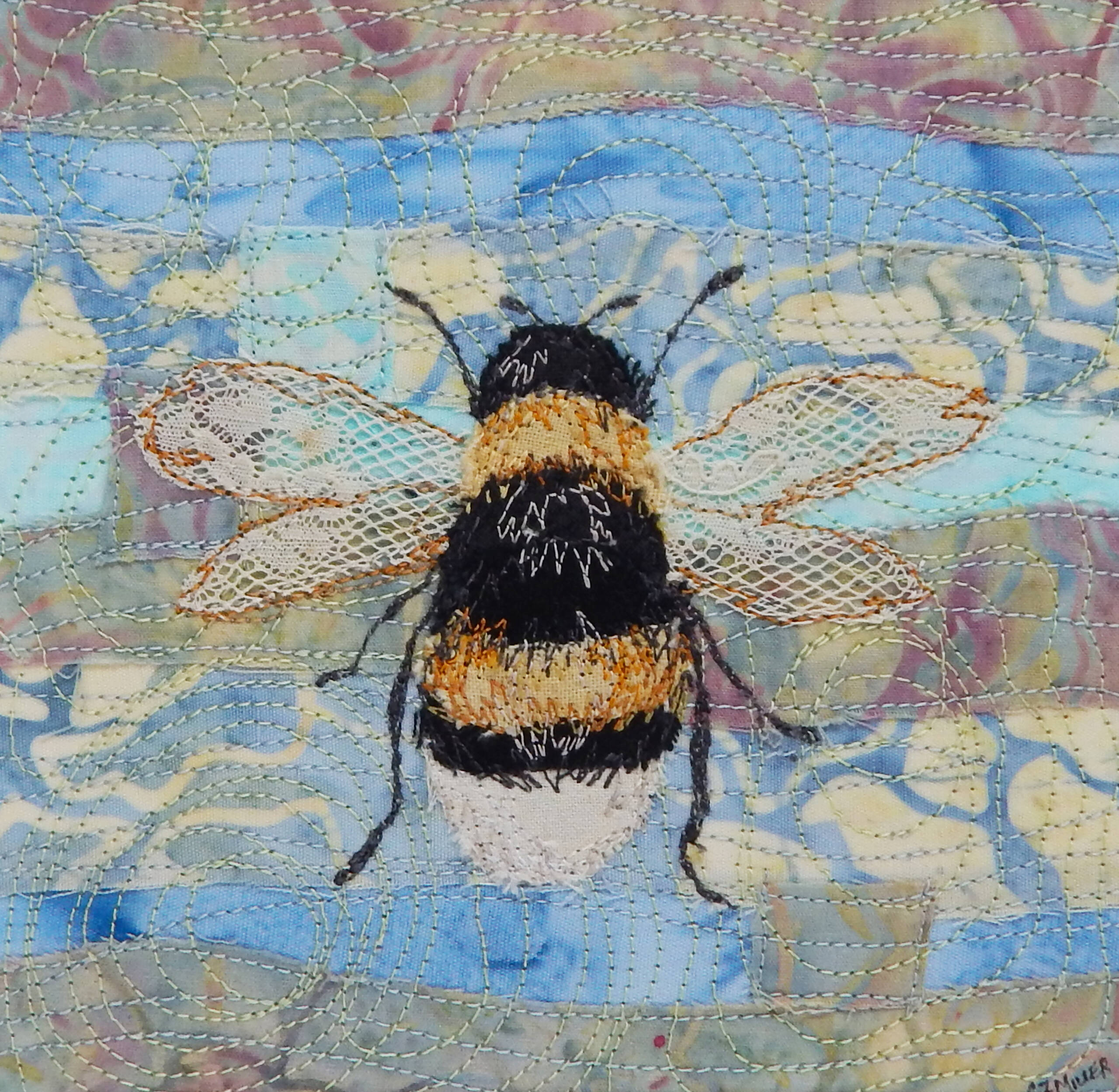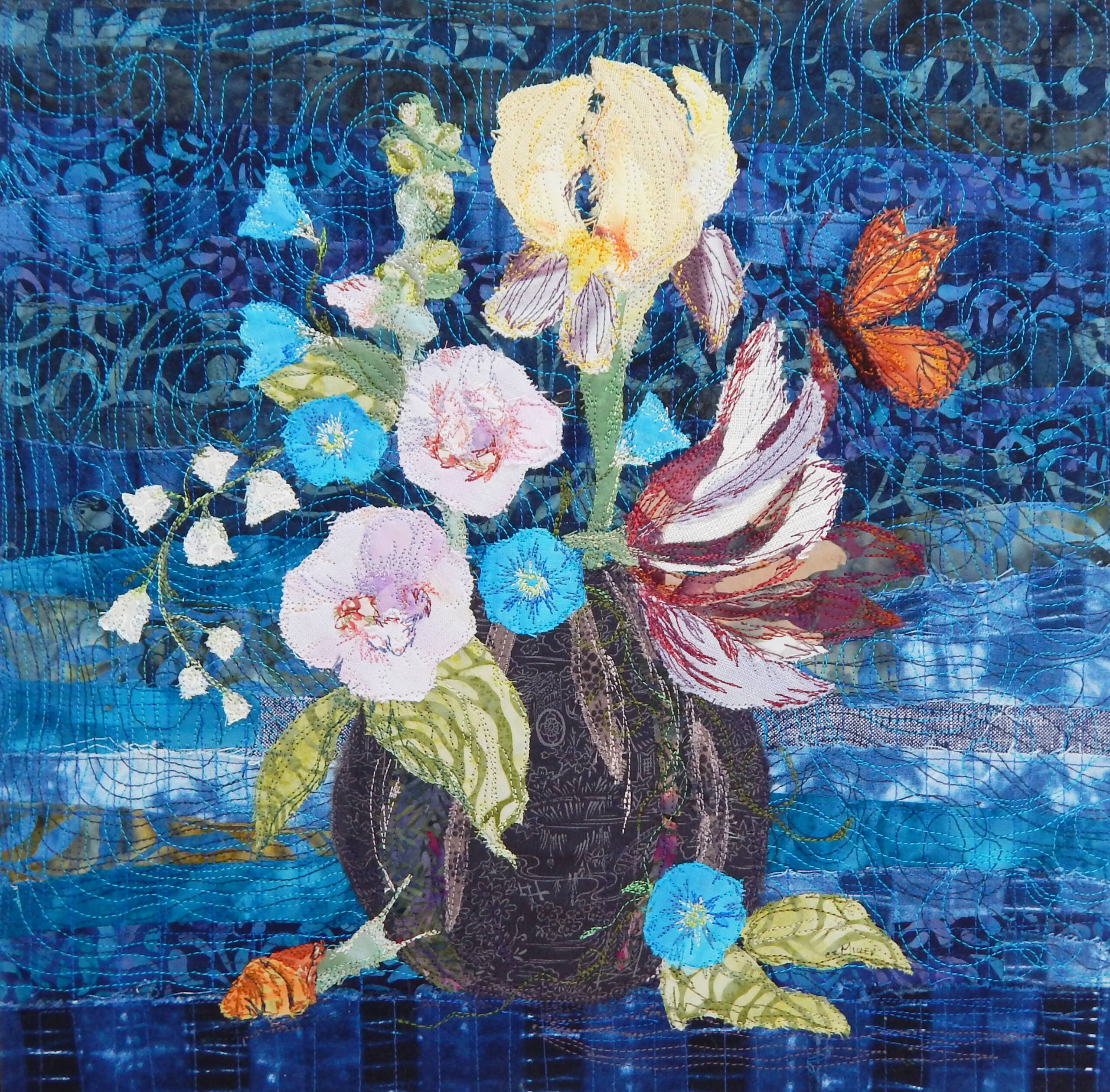 Miller is a textile artist who creates fabric collages using hand-dyed cottons, batiks, and vintage fabrics that are stitched by machine.