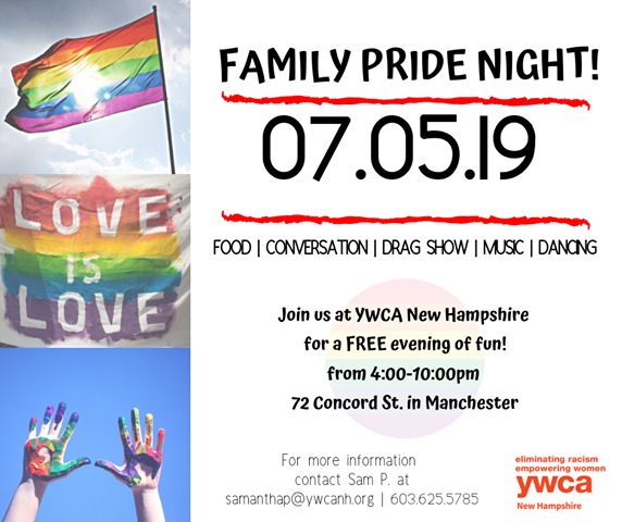 YWCA NH will be hosting a Family Pride Night on July 5 from 4-10 p.m. Join us for food, conversation, drag show, music, dancing and more! This event is free to the public.