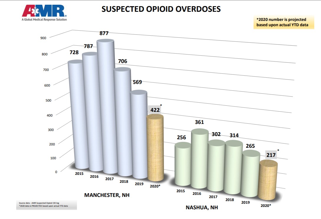 MANCHESTER, NH – A summary of statistics from American Medical Response of Manchester and Nashua opioid overdoses and related data shows an increase is overdoses in Manchester. In addition to the charts below, there are some notable data points provided by Chris Stawasz, Regional Director for AMR, as follows: