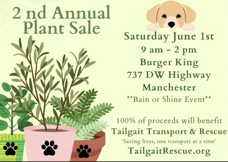 MANCHESTER, NH โ Tailgait Transport and Rescue will be having their second annual plant sale Saturday June 1, at Burger King, 737 DW Hwy.