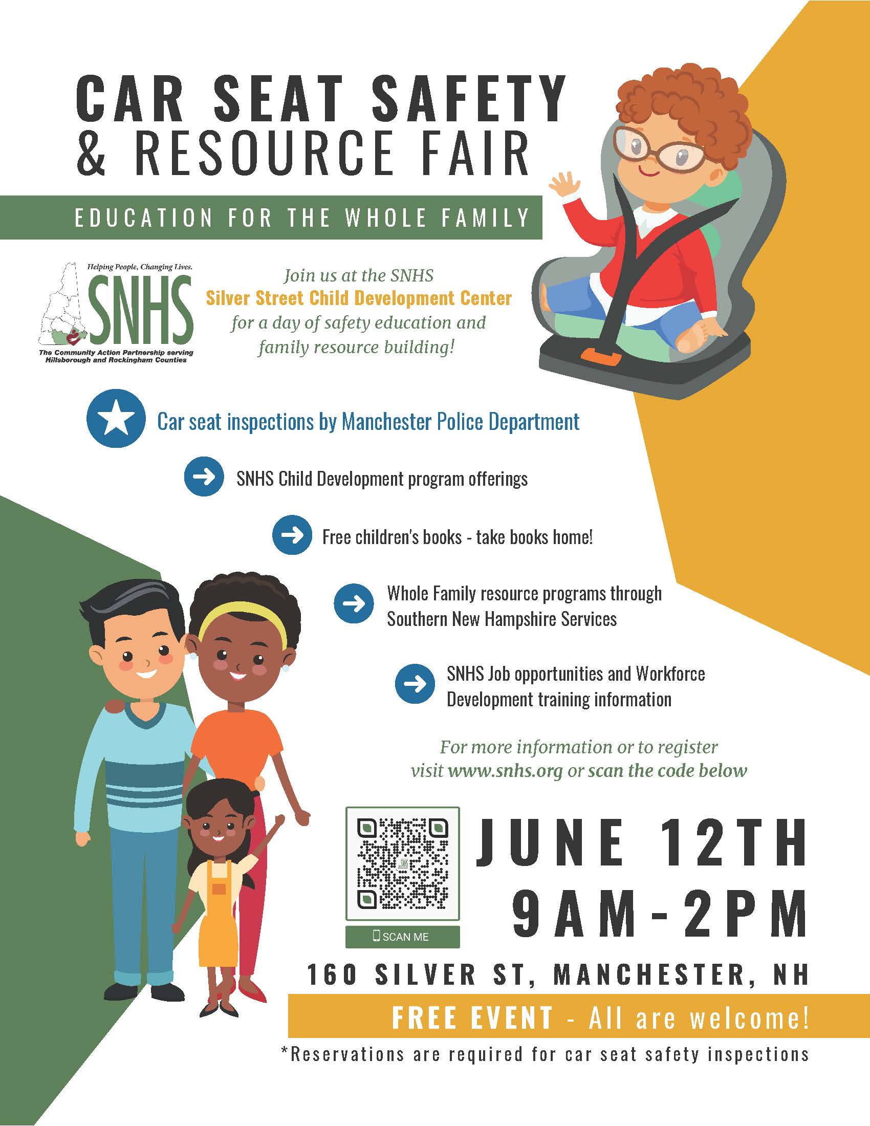 MANCHESTER, NH โ€“The countdown is on to our Car Seat Safety & Resource Fair on June 12 at the Southern NH Services Child Development Center, 160 Silver St. The event runs from 9 a.m. to 12 p.m.