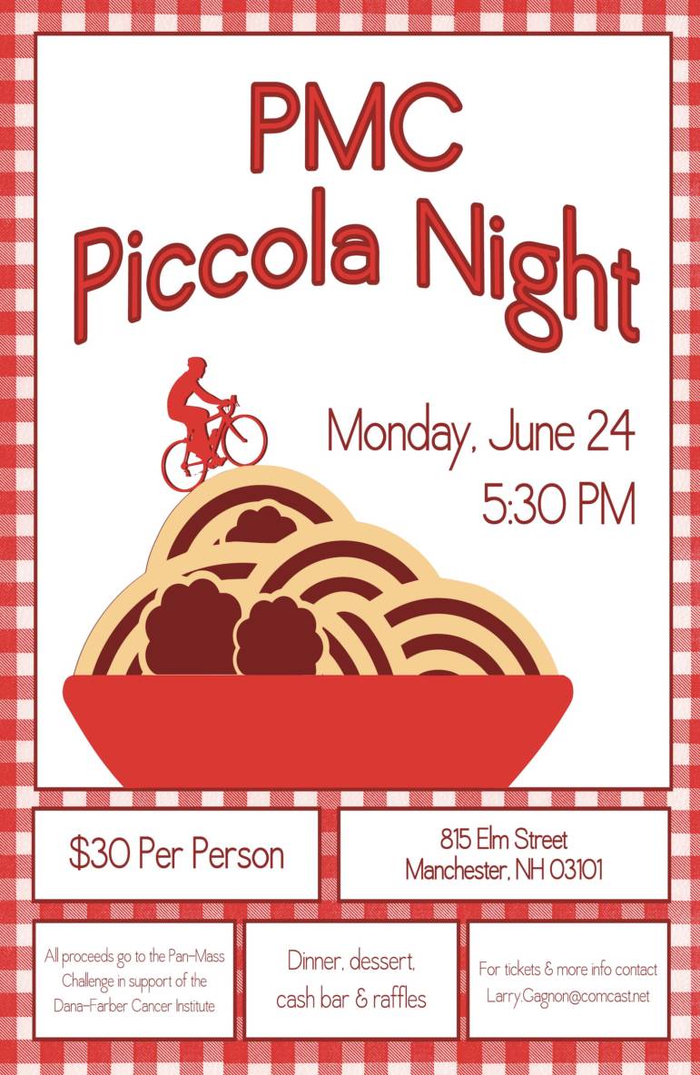 Larry Gagnon will be participating in his 21st Pan Mass Challenge and his annual fundraiser is being held on June 24 at Piccola Italia. Doors open at 5:30 p.m. featuring delicious food prepared by Piccola’s Giovanni Paolini, live music by John Chouinard, an eclectic number of raffle baskets and much more!