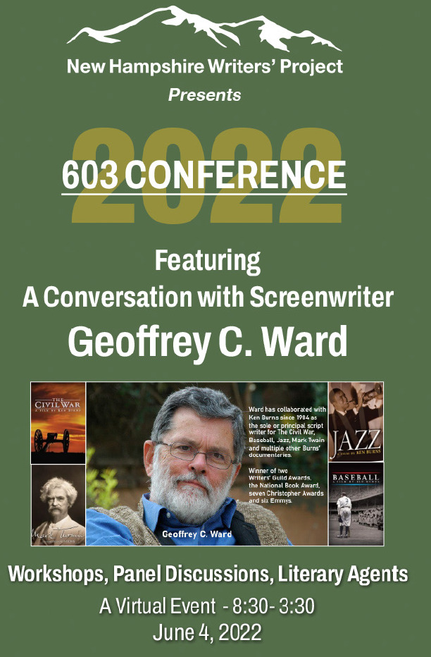 MANCHESTER, NH – The New Hampshire Writers’ Project (NHWP) is hosting its annual 603 Writer’s Conference virtually on June, 4, 2022. The day kicks off at 8:30 a.m. with an in-depth conversation with special guest Geoffrey C. Ward; and culminates with NHWP’s signature Pitch Party that offers attendees the opportunity to make their best book pitch to a panel of professional literary agents, publishers, editors, and celebrated authors. The Pitch Party offers a cash prize of $250 for the winner. Previous Pitch Party winner, Brinda Charry, landed a two-book publishing deal following her win.
