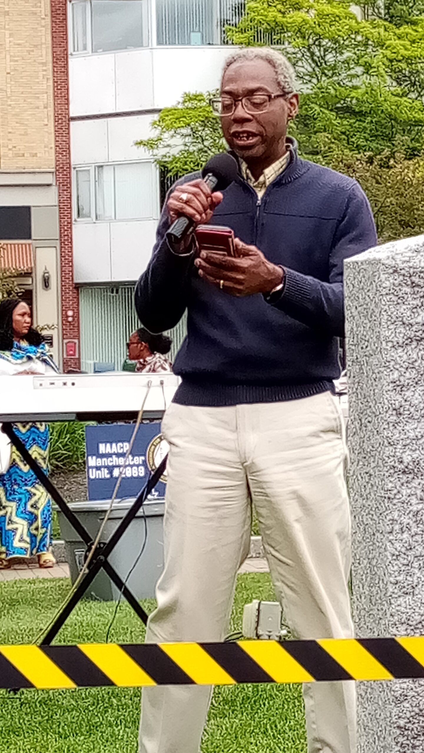 The President of the Manchester NAACP, James T. McKim, spoke next. McKim is the founder and managing partner of a company called Organizational Ignition, which helps businesses improve operating efficiency by, according the company website, “reach and sustain their ignition point through the integration and alignment of business processes, people, and technology.”