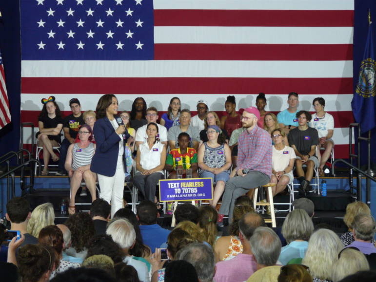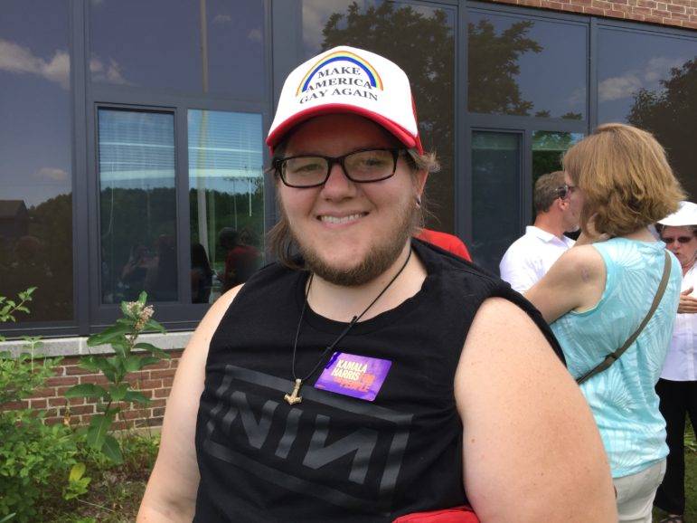 Harris invited a crowd wearing Birkenstocks, feminist T-shirts, flip-flops. Gabe Wilde of Biddeford sported a “Make America Gay Again” baseball cap and wanted to ask Harris if she would work to make community college free for everybody – including new immigrants to America. Wilde works in admissions at a community college in Maine and supports the need for immigrants to simply get some additional education to make it here in the U.S.