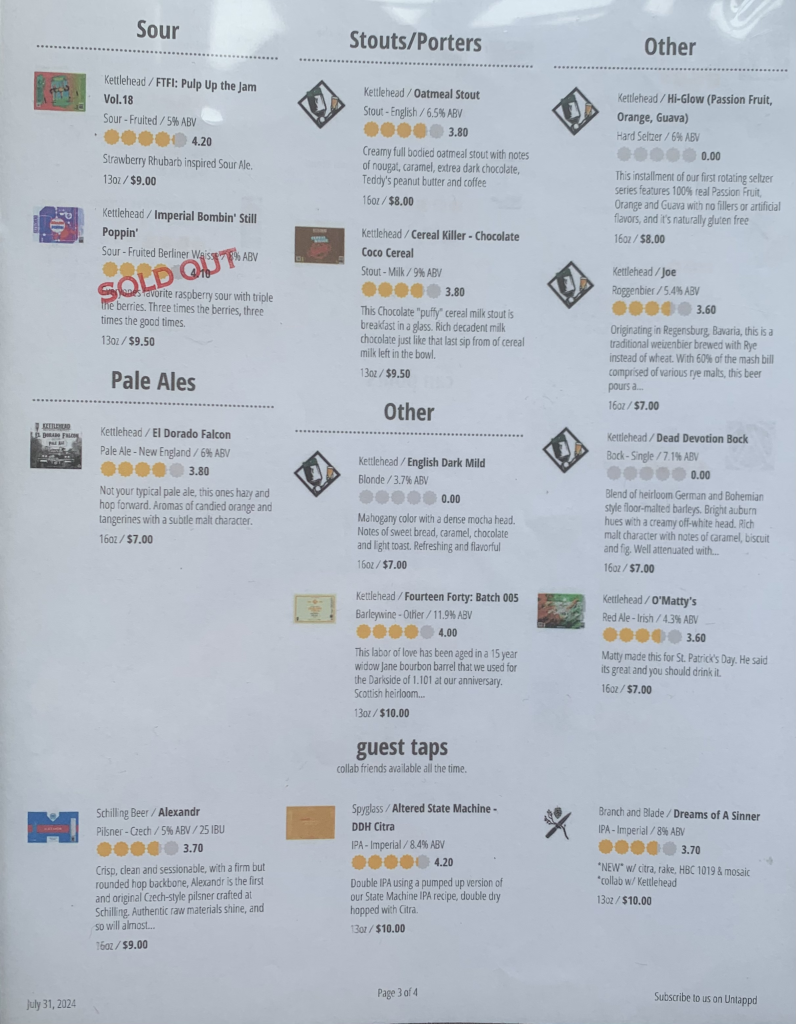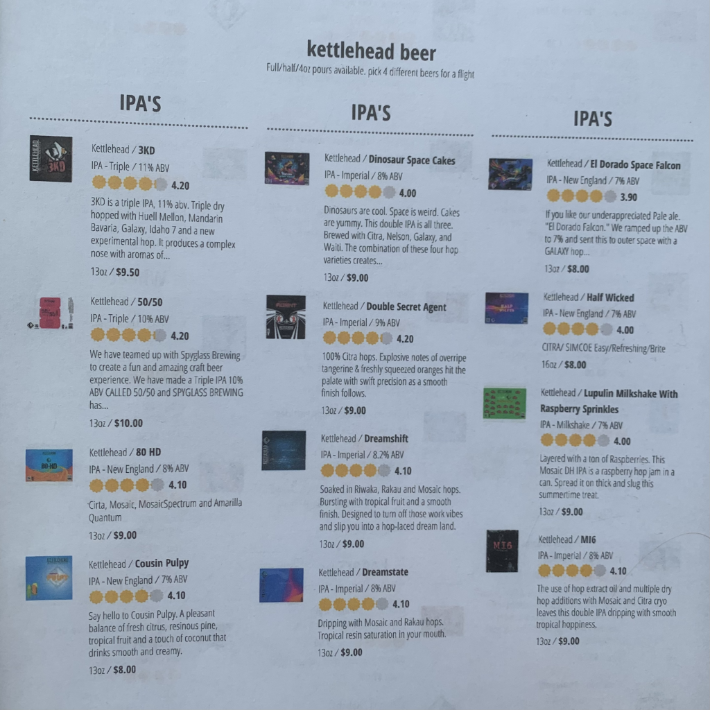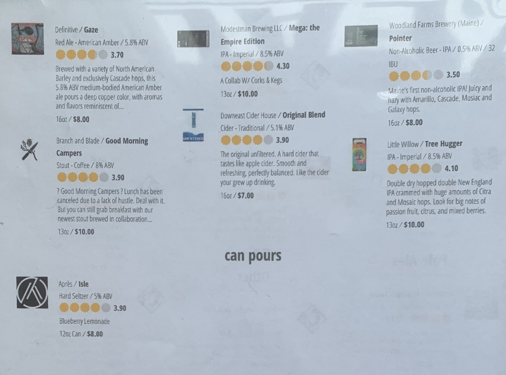 They serve flights, small pours, and full pours. They do not fill growlers at their Nashua location, though that may change in the future. They sell cans, but their availability of cans can be a little hit-or-miss, with some things being available on tap but not in cans. It can be tough if you try something and love it but can’t take any home!