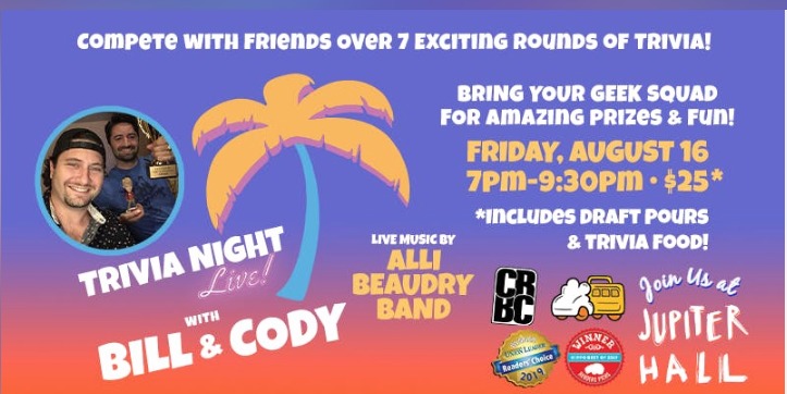 MANCHESTER, NH โย Jupiter Hall is hosting a trivia night on Aug. 16, a first for the venueโs proprietors, Daniel and Katie Berube. Also a first for Bill and Alli Seney. Sort of.