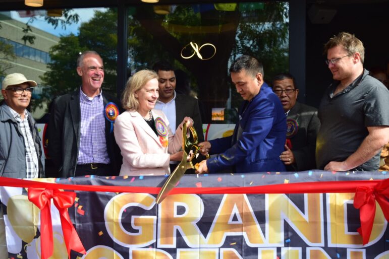 Mayor Joyce Craig shares the giant golden scissors with KS Kitchen owner Saman Budha on Oct. 15 for the grand opening of the Nepali restaurant on Elm Street. Courtesy Photo