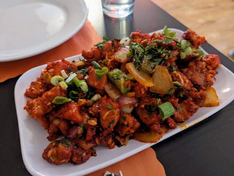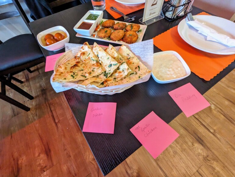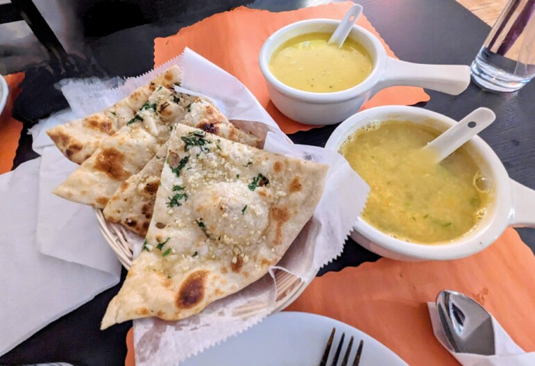 Jim and I ordered a light lunch for the table and a few items to go. The hot garlic chicken from the appetizer menu was craveable and we had no trouble clearing the plate between the two of us. We also got some garlic naan bread and two different soups – Jim went for the Daal soup, which was more savory, and I had the sweet corn soup – both of them were brothy and comforting.