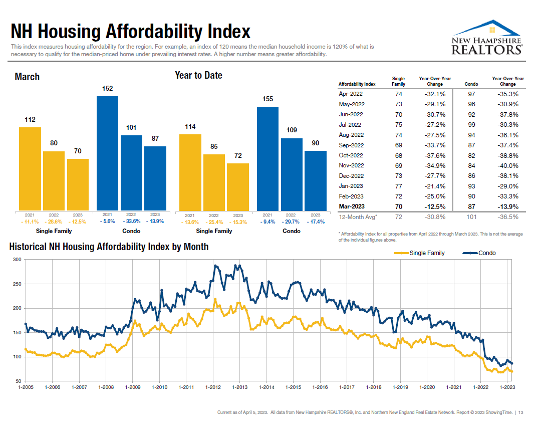 The affordability index took another dive, dropping to 70 from March 2022โs 80 and Februaryโs 72. An affordability index of 70 means that median income in New Hampshire is 70% of whatโs necessary to qualify to buy a median-priced home. The index takes into consideration what a monthly payment would be, measuring price, interest rates, property taxes and insurance.