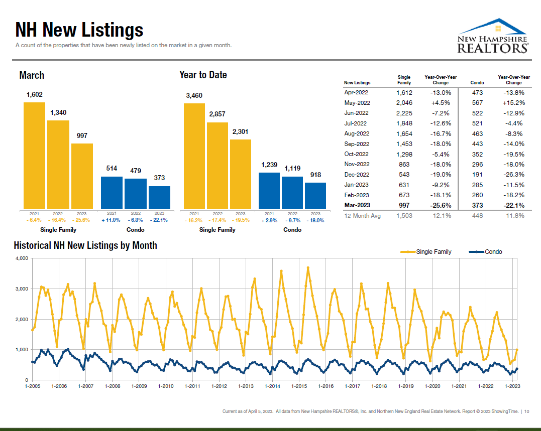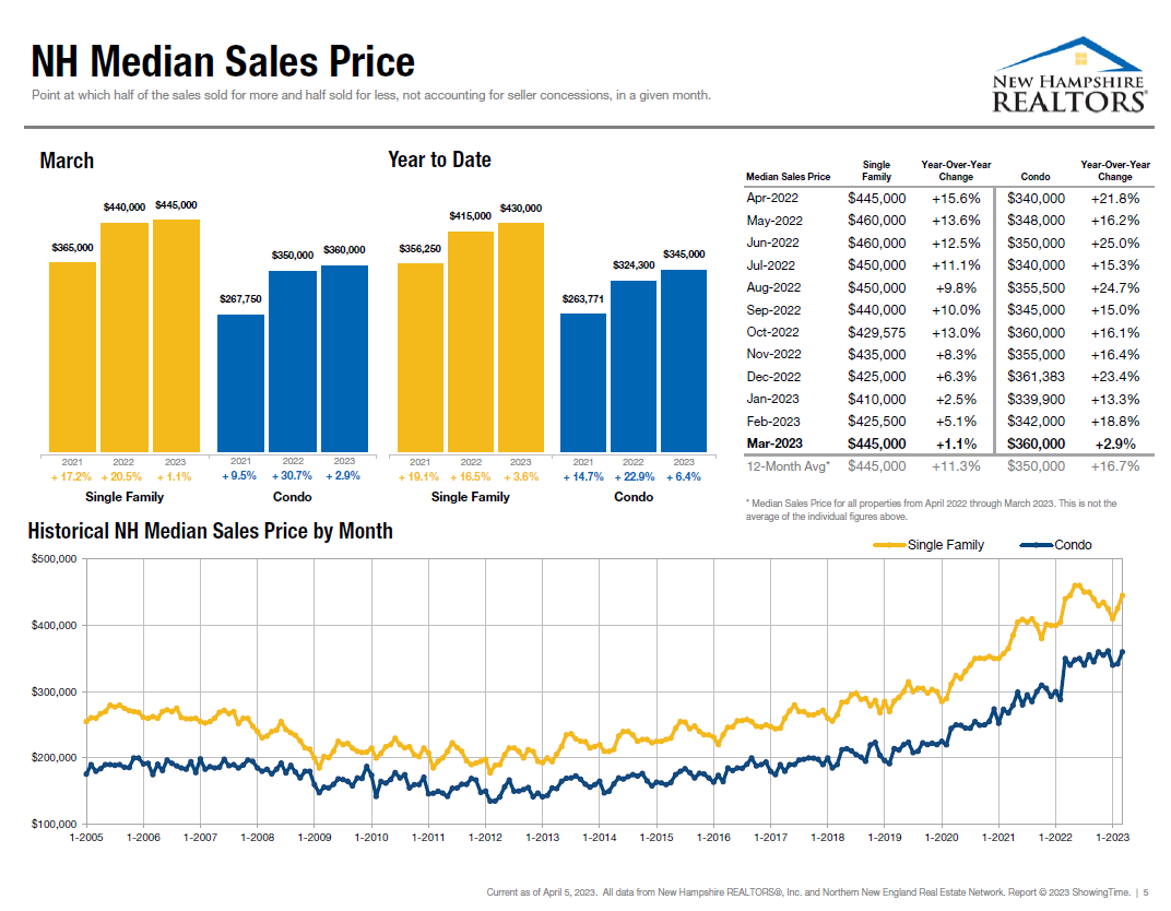 In New Hampshire, however, median sales price continued to increase, up to $445,000 for single-family homes, up from $440,000 a year ago, for a 1.1% increase. The median sales price for condos in March was $360,000, up 2.9% from March 2022.